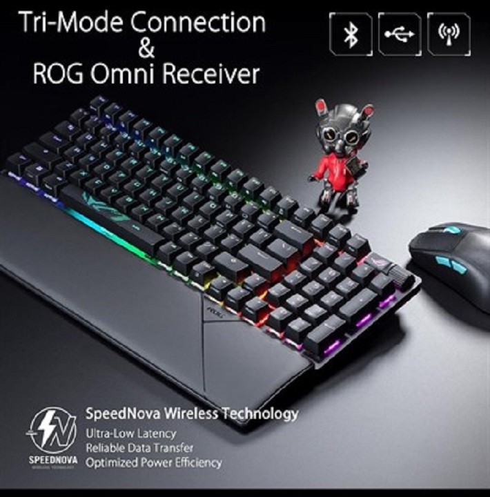 - ROG Strix Scope II 96 Wireless gaming keyboard with tri-mode connection, streamer hotkeys, multifunction controls, hot-swappable pre-lubed ROG NX Snow & Storm mechanical switches, ROG keyboard stabilisers, PBT doubleshot keycaps and silicone dampening foam, three tilt angles, and wrist rest